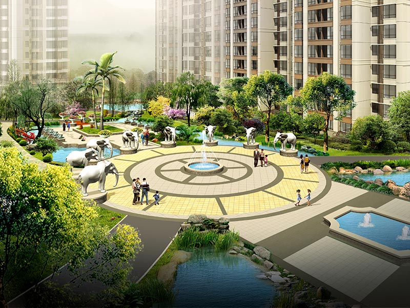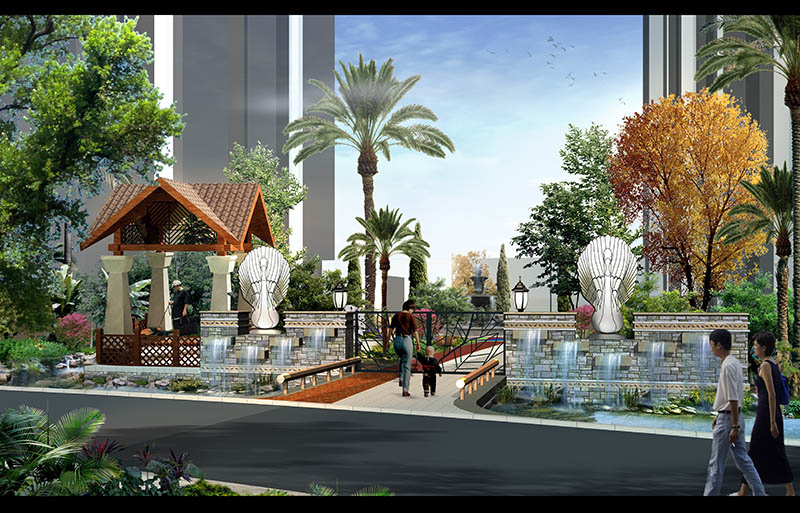 噴泉、神獸泉等多種水景景觀妝點(diǎn)園區(qū),賦予園區(qū)生動的氛圍和聲響;采用硬質(zhì)景觀點(diǎn)題,在主要節(jié)點(diǎn)設(shè)計(jì)神獸雕塑、花臺、燈飾、陶藝等小品突出東南亞特點(diǎn),